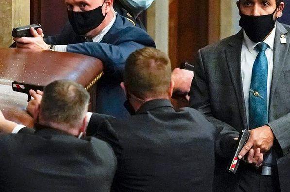 מצד אחד, כשהסתערו על הקפיטול, נורתה למוות אישה בבניין, מצד שני נראו גם אנשי ביטחון עם נשק חד שלוף, כמו כאן, שם הם מגנים על חדר הישיבות מפני פולשים. דקות דרמטיות בקפיטול של ארה”ב.
