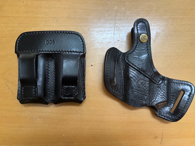 נרתיקים מעור במצב חדש, איכותיים ביותר: נרתיק לאקדח ונרתיק לשתי מחסניות. 100 ש״ח לכל אחד.