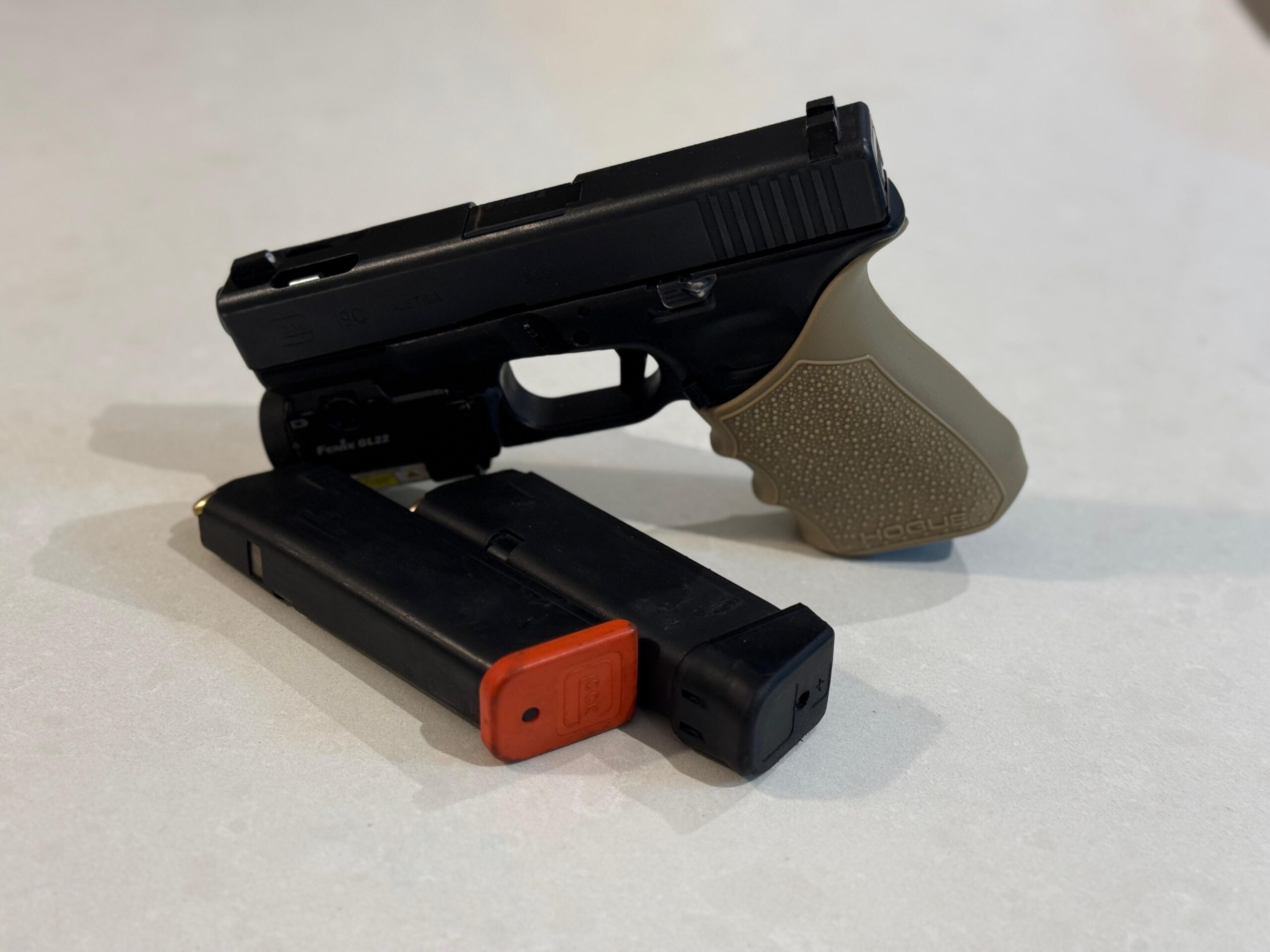 גלוק 19C דור 3, דגם כ״ד , עם מפצה סטייה , משמש את שירות הביטחון , מגיע עם הדק מינוס , עצר מחלק מאורך , פנס עם ציין לייזר+ 2 מחסניות .