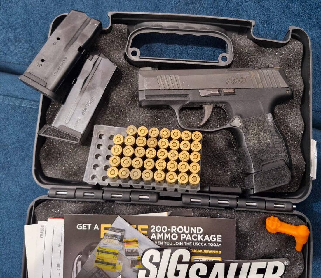 אקדח SIG SAUER P365 . נקנה לפני שנתיים . ירה 150 כדור סה”כ . האקדח במצב מצויין , מגיע עם 50 כדורים , 2 מחסניות סטנדרטיות , מחסנית מוגדלת (12 כדורים) , פונדה וכספת .