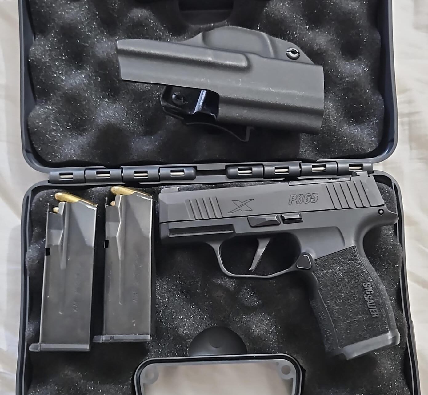 אקדח מסוג sig sauer p365x , נקנה לפני שנה, נמכר עקב רילוקיישן לחו”ל . ירה רק במטווחים של מעמד הרכישה(רישיון) . מגיע עם 2 מחסניות נרתיק פנימי וכייס נשיאה.